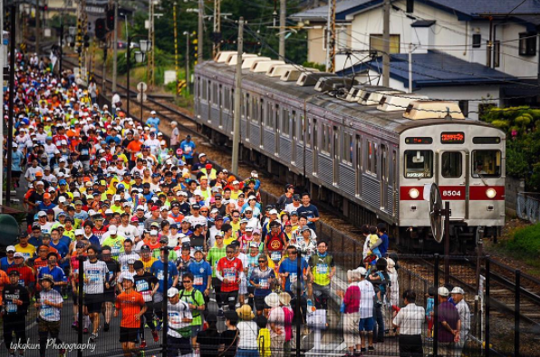 小布施町民の足でもある電車と、皆さまの走る姿のコラボが素敵です。
